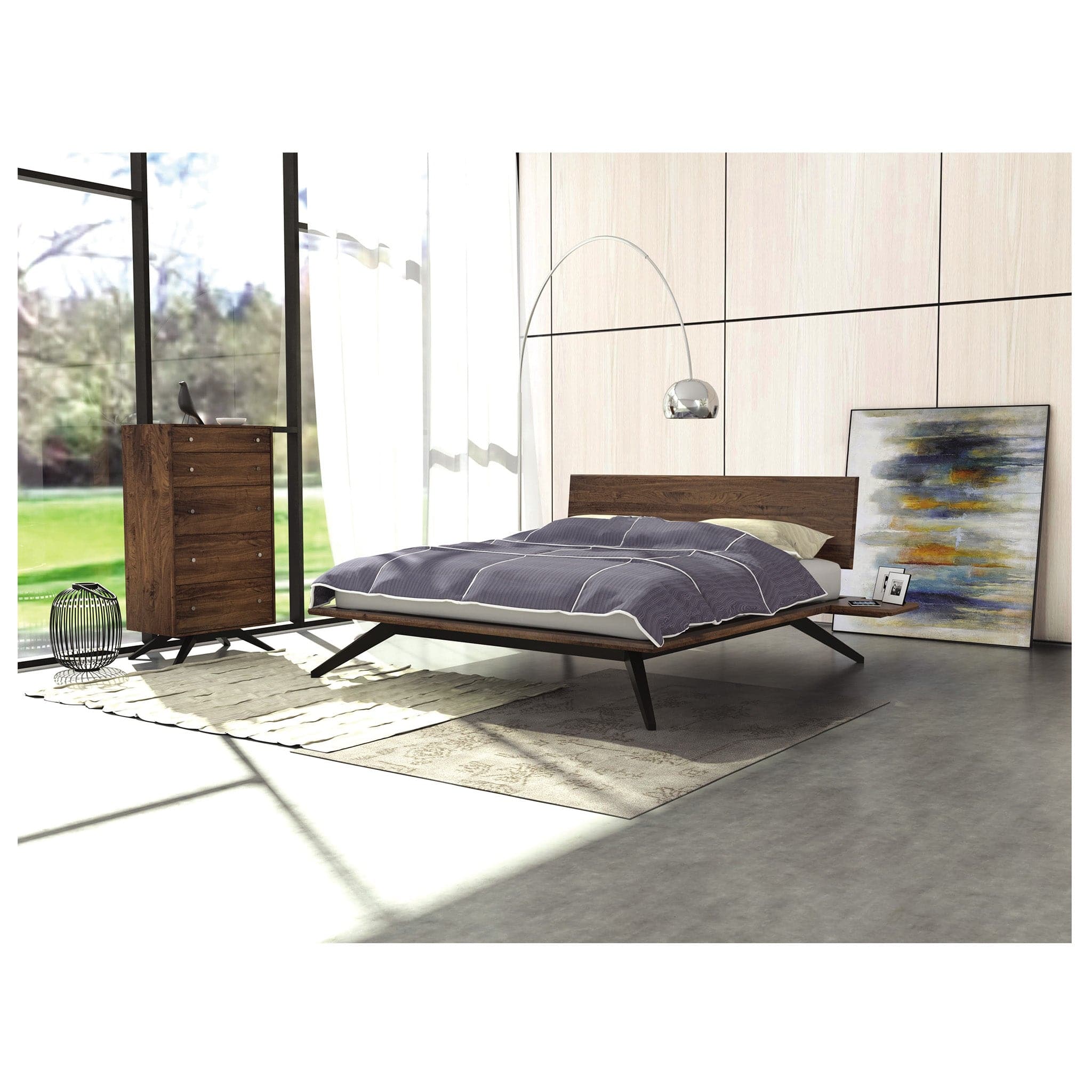 Like all Copeland Astrid Platform Beds, the bed with the 1-Panel Headboard features a solid plywood deck that provides a stable and sturdy base for the mattress, eliminating the need for a box spring. The angled legs of the bed provide additional support and stability while also adding to the bed's modern look.
